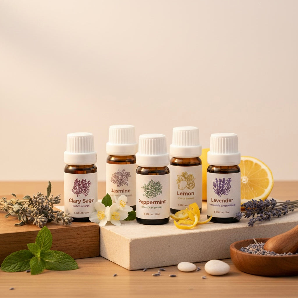This essential oils set includes five popular natural aromas designed for everyday aromatherapy use. Each oil is bottled in amber glass to help maintain freshness and scent quality, making it ideal for diffusers, relaxation routines, and home fragrance.